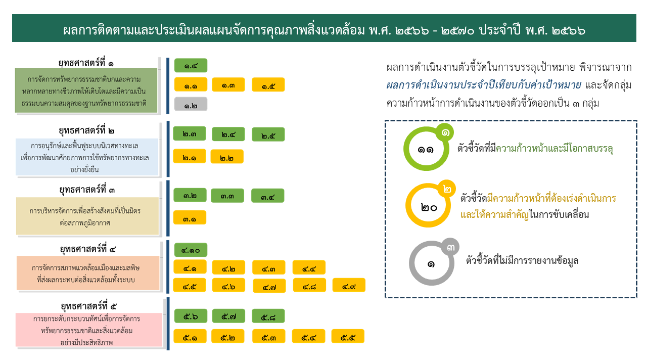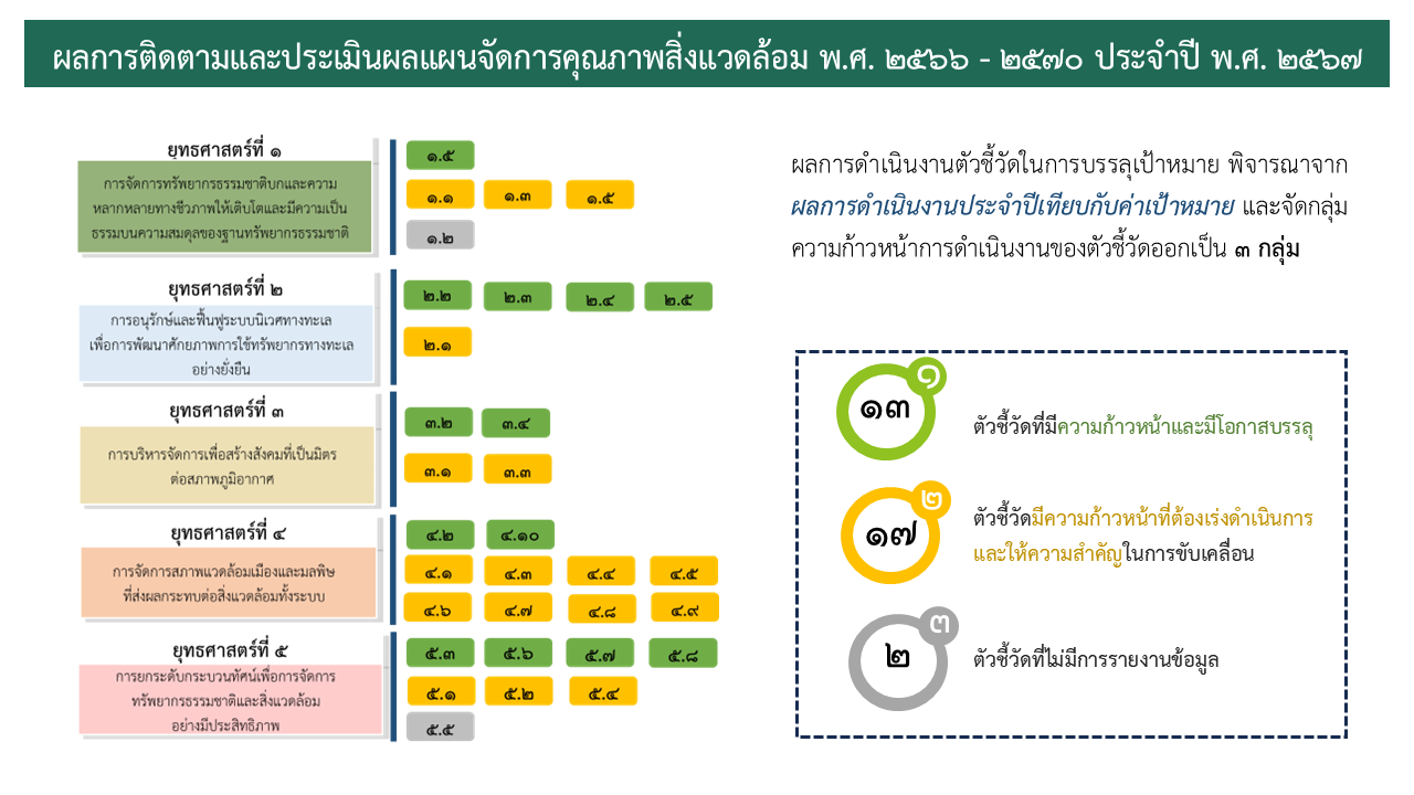 สำนักงานนโยบายและแผนทรัพยากรธรรมชาติและสิ่งแวดล้อม (สผ.) ติดตามประเมินผลการดำเนินงานตัวชี้วัดของนโยบายและแผนการส่งเสริมและรักษาคุณภาพสิ่งแวดล้อมห่งชาติ และแผนจัดการคุณภาพสิ่งแวดล้อม เพื่อนำผลที่ได้มาวิเคราะห์สำหรับใช้ในการวางแผน ทบทวนและปรับปรุง หรือกำหนดนโยบายเพิ่มเติมได้อย่างมีประสิทธิภาพ โดย สผ. ติดตามและรวบรวมผลการดำเนินงานของตัวชี้วัดภายใต้แผนจัดการฯ พ.ศ. 2566 – 2570 ประจำทุกปี ซึ่งการติดตามตัวชี้วัดจะแสดงข้อมูลผลการดำเนินงานย้อนหลัง 1 ปี และจะเผยแพร่ข้อมูลดังกล่าวในรายงานการติดตามประเมินผลแผนจัดการคุณภาพสิ่งแวดล้อม พ.ศ. 2566 - 2570 ประจำปี โดยได้รับความร่วมมือจากภาคีเครือข่ายและหน่วยงานที่เกี่ยวข้องในการสนับสนุนข้อมูลการดำเนินงาน