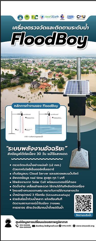 FloodBoy "ระบบพลังงานอัจฉริยะ" เป็นเครื่องตรวจวัดและติดตามระดับน้ำที่สามารถส่งข้อมูลได้ต่อเนื่อง 30 วัน ใช้พลังงานจาก Solar Cell พร้อมแบตเตอรี่สำรอง ส่งข้อมูลออนไลน์แล้วอัปโหลดเก็บที่ Cloud Server และแสดงผลบนเว็บไซต์แบบReal time ทุก 1 นาที