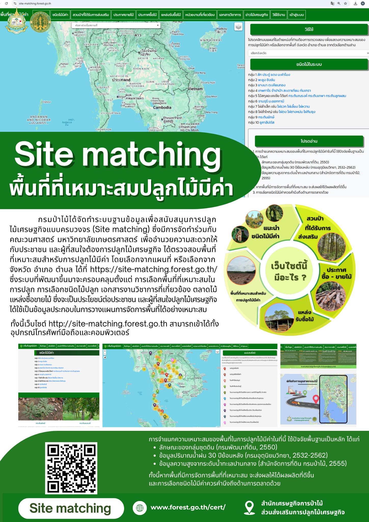 Site Matching เป็นเว็ปไซต์ที่ใช้แสดงพื้นที่ที่เหมาะสมในการปลูกไม้มีค่า โดยเลือกจากแผนที่หรือเลือกจากจังหวัด อำเภอ ตำบล ซึ่งระบบพัฒนาครอบคลุมตั้งแต่การเลือกพื้นที่ที่เหมาะสม การเลือกชนิดไม้ปลูก แนะนำชนิดไม้มีค่า การประกาศซื้อ - ขายไม้ ซึ่งเป็นการเปิดโอกาสให้ผู้ซื้อและผู้ขายไม้สามารถติดต่อกันได้โดยตรง ซึ่งจะเป็นประโยชน์ต่อประชาชนและผู้ที่สนใจใช้เป็นข้อมูลประกอบการวางแผนการจัดการพื้นที่ได้อย่างเหมาะสม